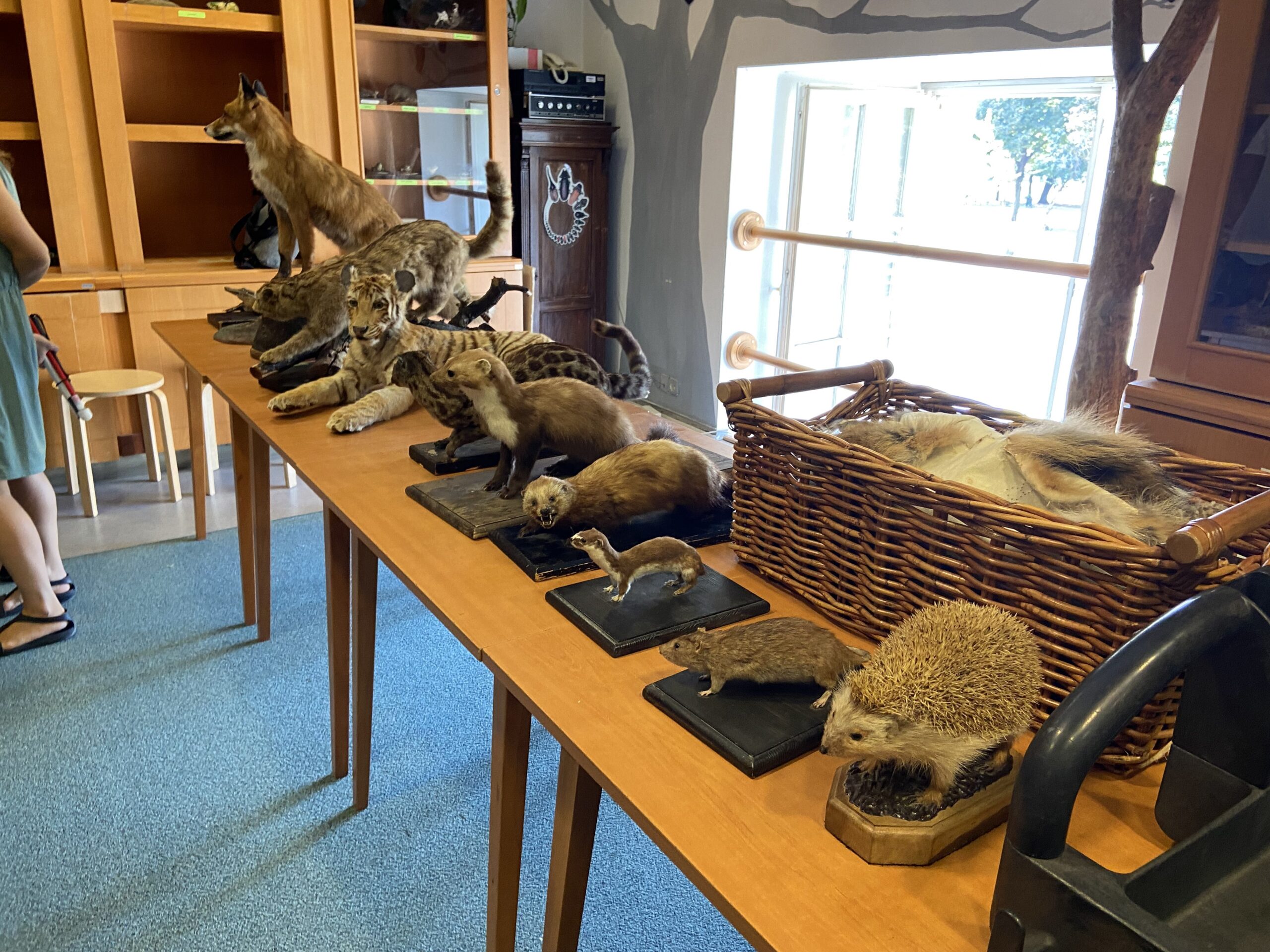 A következőkben asztalokra helyezett, kitömött állatokat simogathattunk