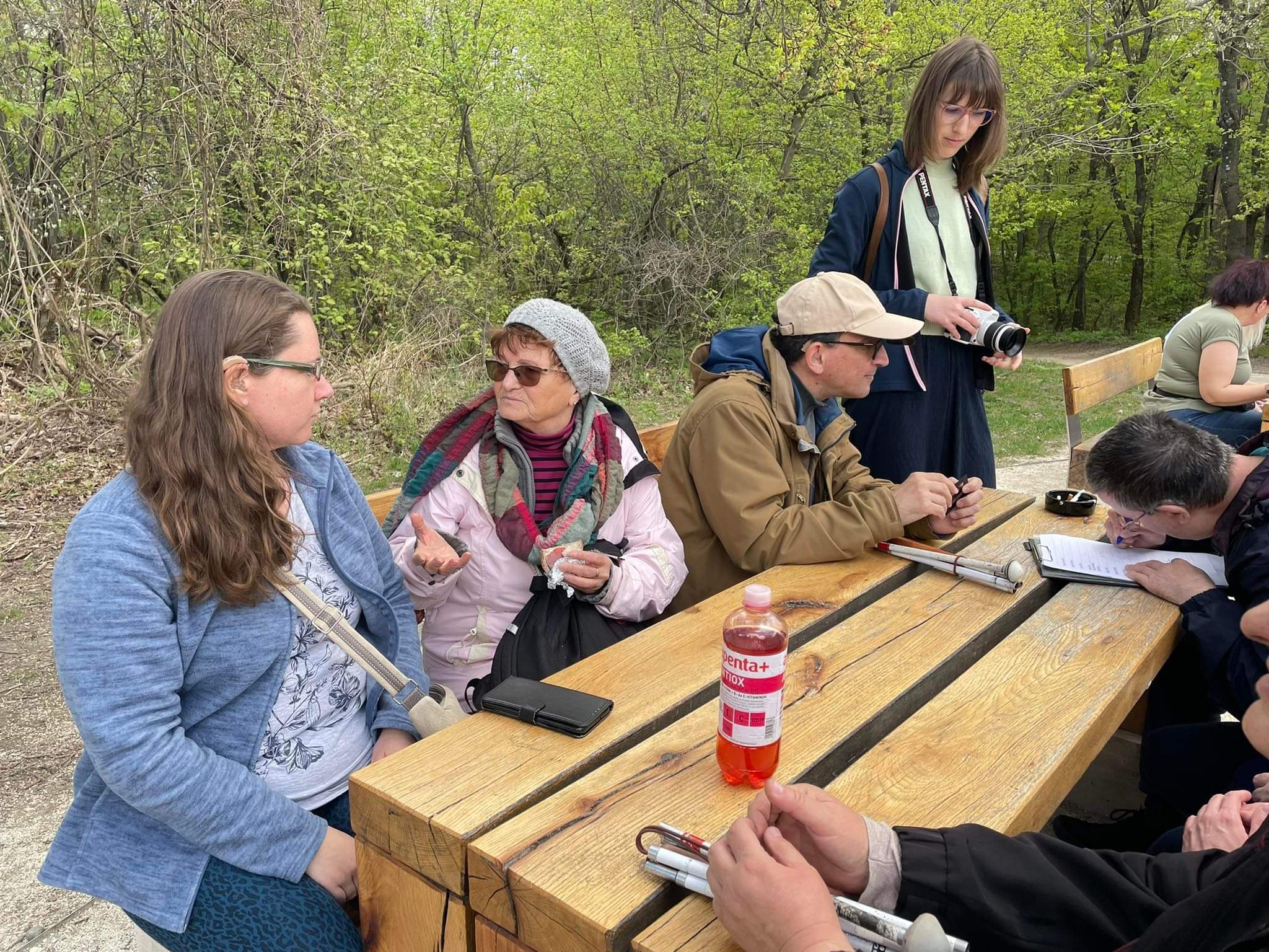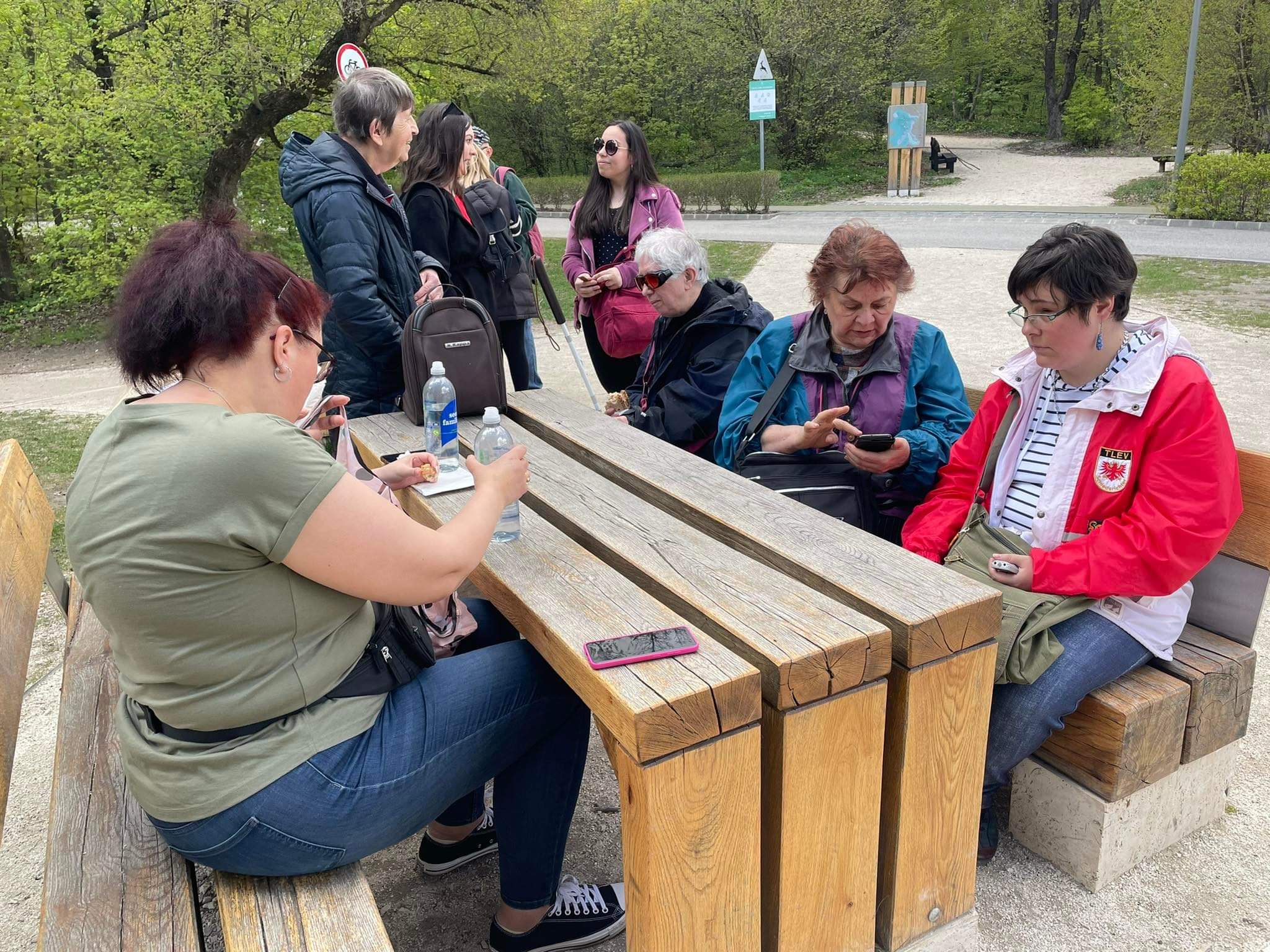 Ami itt fogadott minket: jó levegő, madárcsicsergés, simogató napsütés. Ráérősen sétáltunk a fák között, míg el nem értük a Libegő felső állomását. Letelepedtünk a szabadban kihelyezett asztalok köré a padokra. Itt kicsit megpihentünk, volt mód beszélgetésre, illetve aki hozott magával elemózsiát, megebédelhetett.